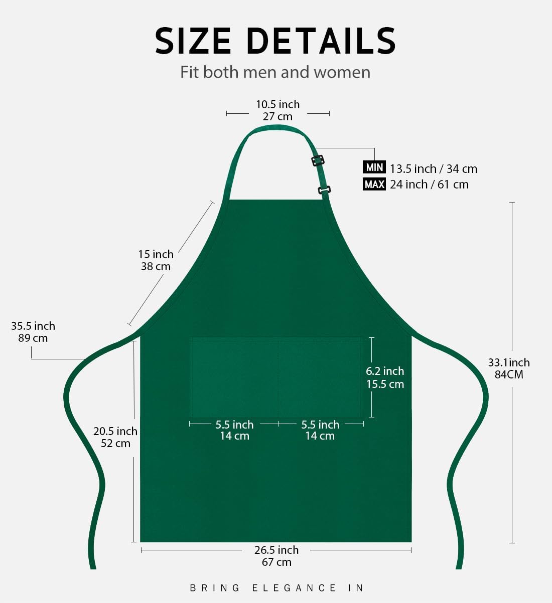 - We chose the dimensions of a 26.77×33.07 inches apron to better-fit men and women. The shoulder straps can be adjusted from a minimum of 13.5 inches to a maximum of 24 inches, allowing for adjust based on coverage needs. With 2 tie straps measuring 35.5 inches each, they adapt well to different body types and can be adjusted for preferred tightness.